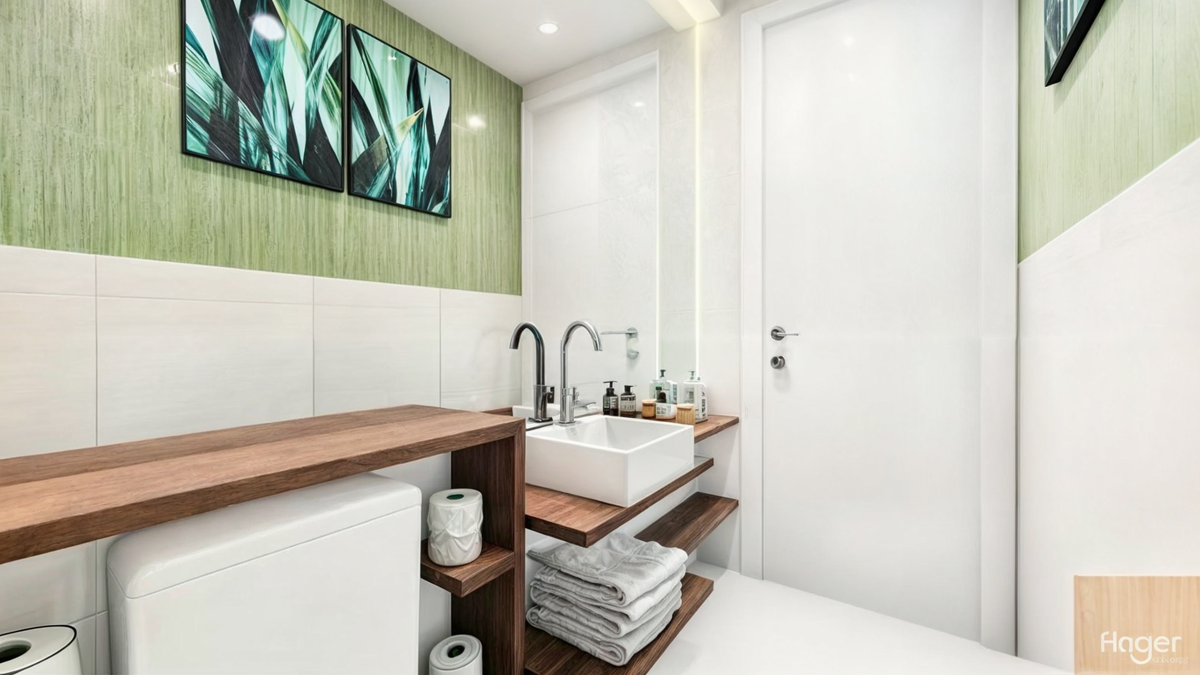 A cliente solicitou um projeto dos seus banheiros, a pedido dela um banheiro aconchegante que saísse do padrão! Por isso um sem gabinete e com papel de parede verde!